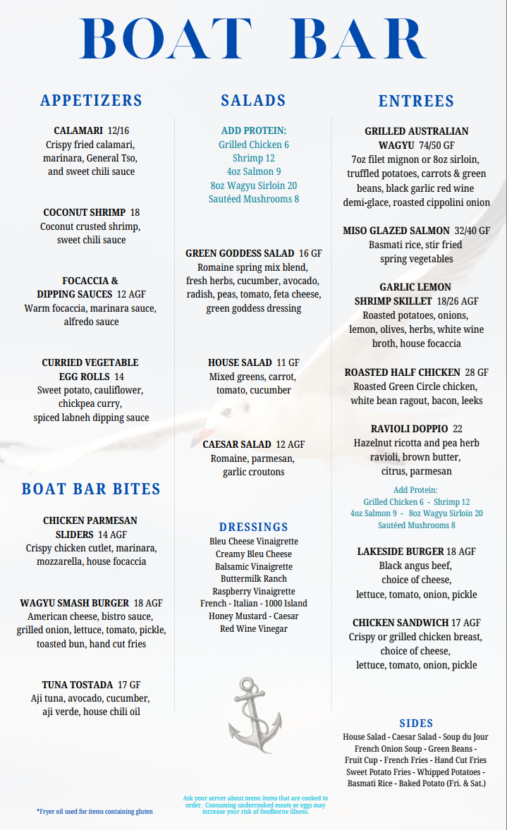 Our year-round restaurant in the main Clubhouse offers a dining room and summer patio that overlook beautiful Gull Lake. Serving incredible dishes created by our Executive Chef, David Carey, the Boat Bar also features a full bar!